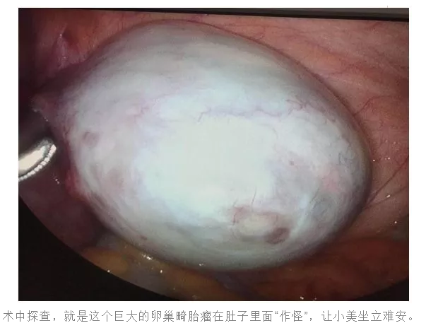 小美通过各项检查,结合肿瘤标记物的检查结果,初步诊断为妊娠合并卵巢肿瘤,良性肿瘤可能性大。通过妇科医生组讨论,一致决定为小美行腹腔镜下卵巢瘤剥除术。